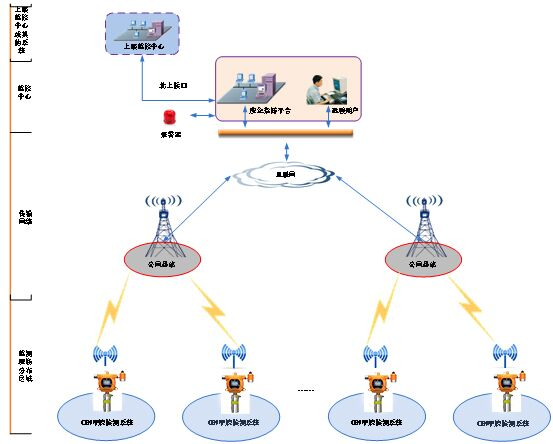 系統(tǒng)由前端監(jiān)測(cè)設(shè)備、傳輸網(wǎng)絡(luò)、后端應(yīng)急管理平臺(tái)等組成,實(shí)現(xiàn)在線實(shí)時(shí)監(jiān)測(cè)。用戶可使用移動(dòng)終端,電腦查看監(jiān)控中心數(shù)據(jù)。